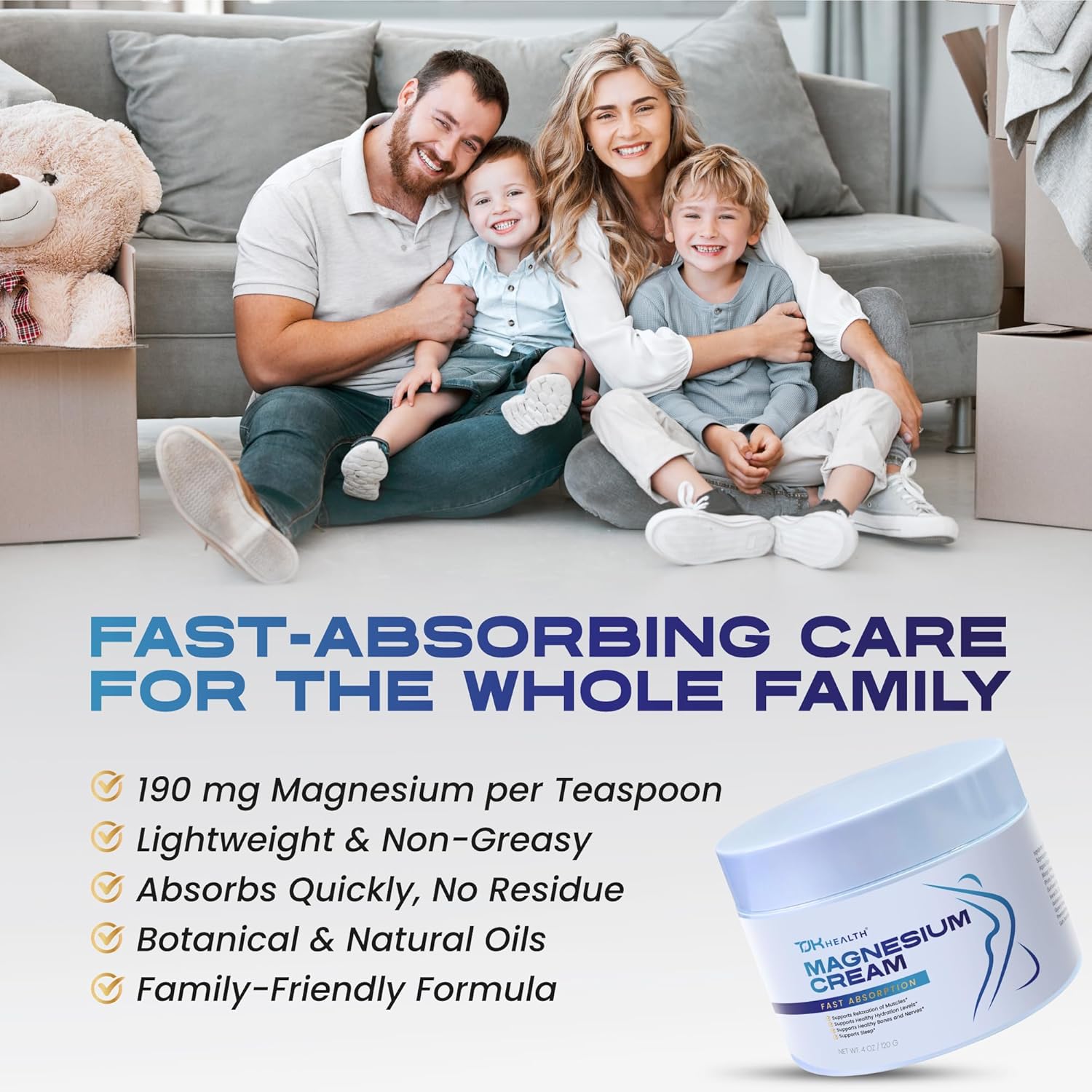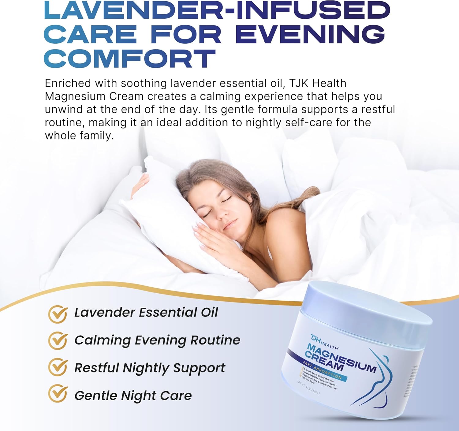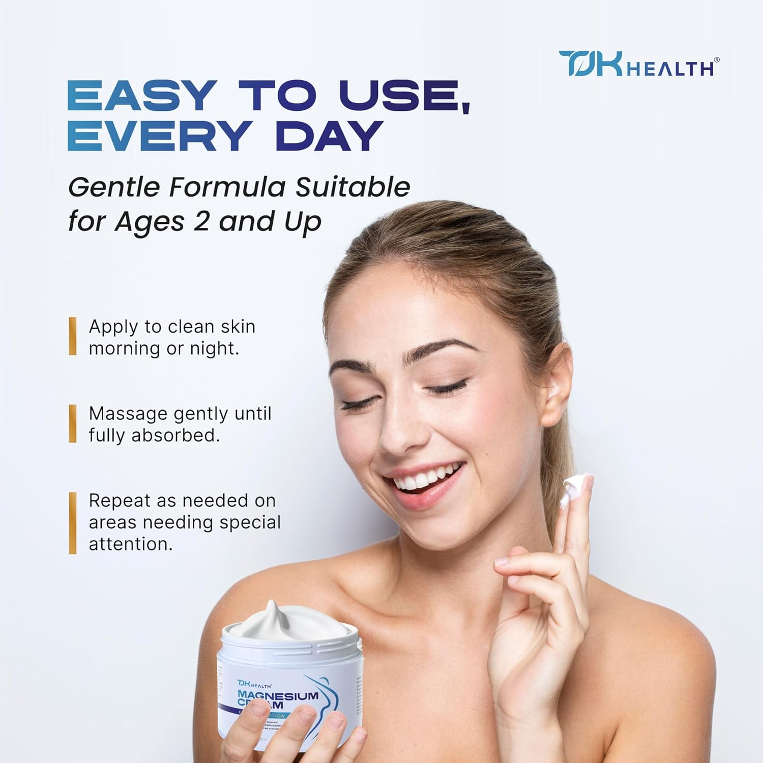 Gentle and Family-Friendly Formula: TJK Health Nighttime Magnesium Cream is designed for the whole family, with a clean formula suitable for children ages 2 and up. Made with naturally derived ingredients and free from harsh chemicals, artificial colors, or unnecessary additives, this topical magnesium cream provides safe replenishment while also nourishing the skin. Gentle enough for daily use, it offers a versatile option for men, women, and kids seeking consistent magnesium support.